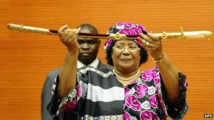 Banda took office as President following the sudden death of President Bingu wa Mutharika. She was Malawi's fourth president[3] and its first female president. Before becoming president, she served as the country's first female vice-president.[4]